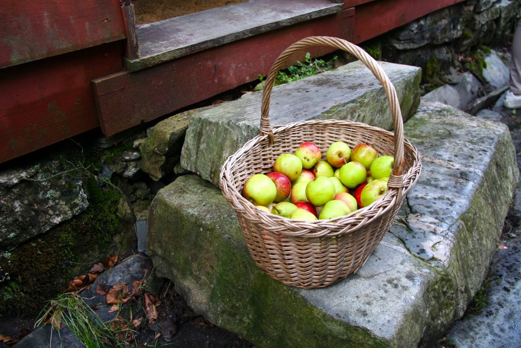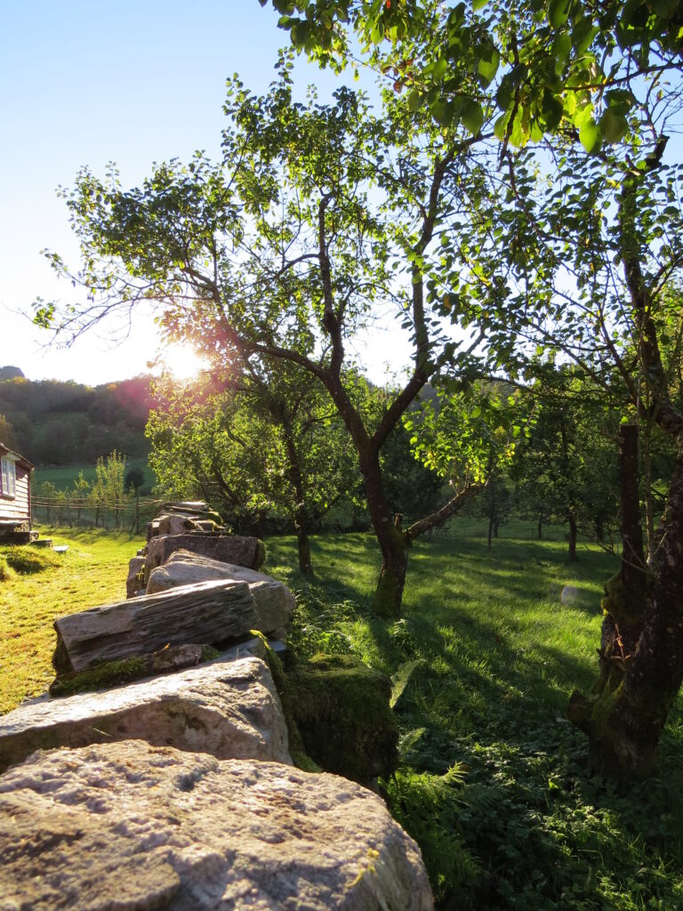 FRUIT HISTORY: An old stone wall separates the main house of the farm from the fruit historical garden, which was opened in 1990. (Photo: Vegard Terøy)