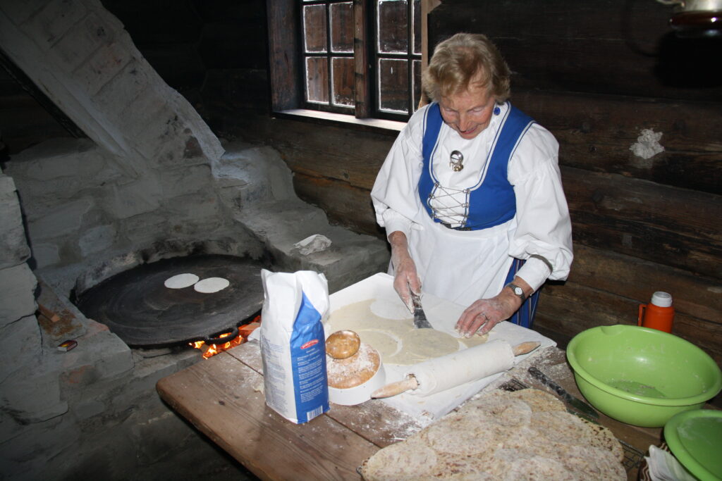 THE COOKING HOUSE: After the restoration, the cooking house can be used for baking sour cakes and potato cakes. Anna Sæbø shows how it should be done. (Photo: Morten Hetland)