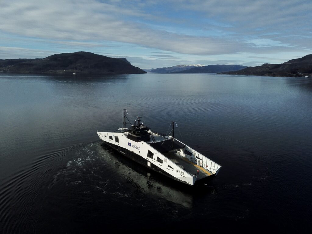 ELFERJE: MF «Nesvik» er den første elferja i Hjelmeland-sambandet. Den blei sett i drift sommaren 2021, og får snart følgje av søsterskipet MF «Hydra», som er verdas første hydrogen-elektriske bilferje. (Foto: Morten Hetland)