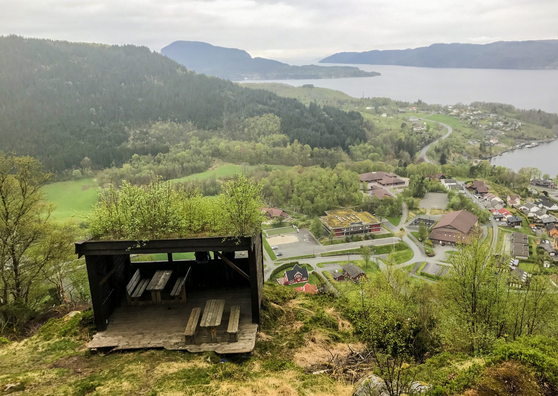 Toppen av Hjelmen ligg 207 meter over havet, men utsikta er best frå rasteplassen og utsiktspunktet på vestsida. Der finn du òg ein rasteplass med kombinert scene og gapahuk, benker i amfi og steinskulpturen «Northern Winds». Denne skulpturen er ein del av turløypa «Skulp-turen».